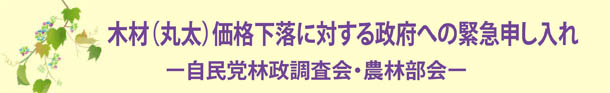自由民主党政務調査会林政調査会及び農林部会は8月9日に合同で、「木材(丸太)の価格下落に対する政府への緊急申し入れ 」を郡司 彰 農林水産大臣及び羽田雄一郎 国土交通大臣に対し行った。その内容は、次のとおりとなっている。
