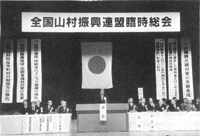 全国山村振興連盟の平成10年度臨時総会は、12月3日(木)午前10時30分から東京内幸町のイイノホールにおいて、衆参国会議員をはじめ政府関係者等来賓多数出席のもとに会員、支部事務局員ほか約1,100名が参加して盛大に開催された。 総会は、山口副会長(岩手県新里村長)の開会の辞ではじまり、連盟 玉澤会長の挨拶に続いて、国土庁長官 井上吉夫氏の代理として国土政務次官 谷川秀善氏、自由民主党総合農政調査会長 谷洋一氏並びに全国町村会長 黒澤丈夫氏の代理として、全国町村会副会長 平野博氏からそれぞれ祝辞を述べられた。 続いて、国会議員をはじめ、政府関係の来賓紹介の後、剱持事務局長から(1)第24回全国山村振興シンポジウムの開催及び(2)第7回ふるさと山村フォトコンテストの実施状況等を含め、最近の山村をとりまく情勢の報告を行った。 議長は、黒澤副会長がつとめ報告事項並びに議事案件の審議に入り、次のとおりそれぞれの議案について、承認、議決され審議を了した。 以上で議事を終了し、中井副会長(岐阜県高根村長)の閉会の辞、及び同副会長の発声で全国山村振興連盟の万歳を三唱して総会の幕を閉じた。 総会後は、出席会員により町村長副会長を班長とした陳情班を編成し、決議された要望事項について、早速政府関係省庁に対し強力な陳情を行った。 特に今回は、堂々会議等で「山村は国の宝、山村の衰退は民族の存亡に係わることだ。山村地域の振興のため、連盟会員の先頭に立って努力する。」と発言されている玉澤会長が、自ら先頭に立って、東北ブロック陳情班(班長 山口副会長)の方々とともに大蔵省に赴き、山村振興予算重点項目を中心に、同省幹部に対して熱意をこめた強力な要請を行った。 | ||||||||||||||||