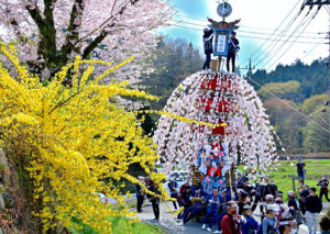 春ののどかな田園風景の中を秩父屋台囃子の笛太鼓と子供たちの囃子手の声を響かせながら、ゆっくり2基の笠鉾を曳き回します。